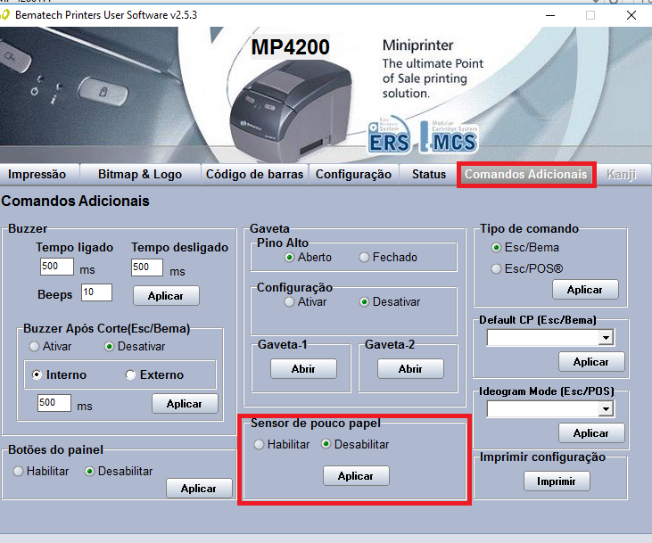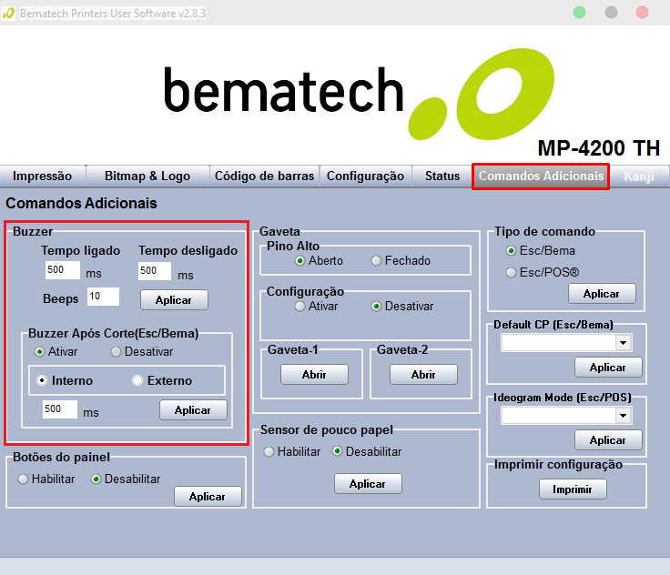Solicite ao cliente que acesse a aba "Comandos Adicionais", em "Tipo de comando" selecione a opção "Esc/Bema" e clique em "Aplicar".